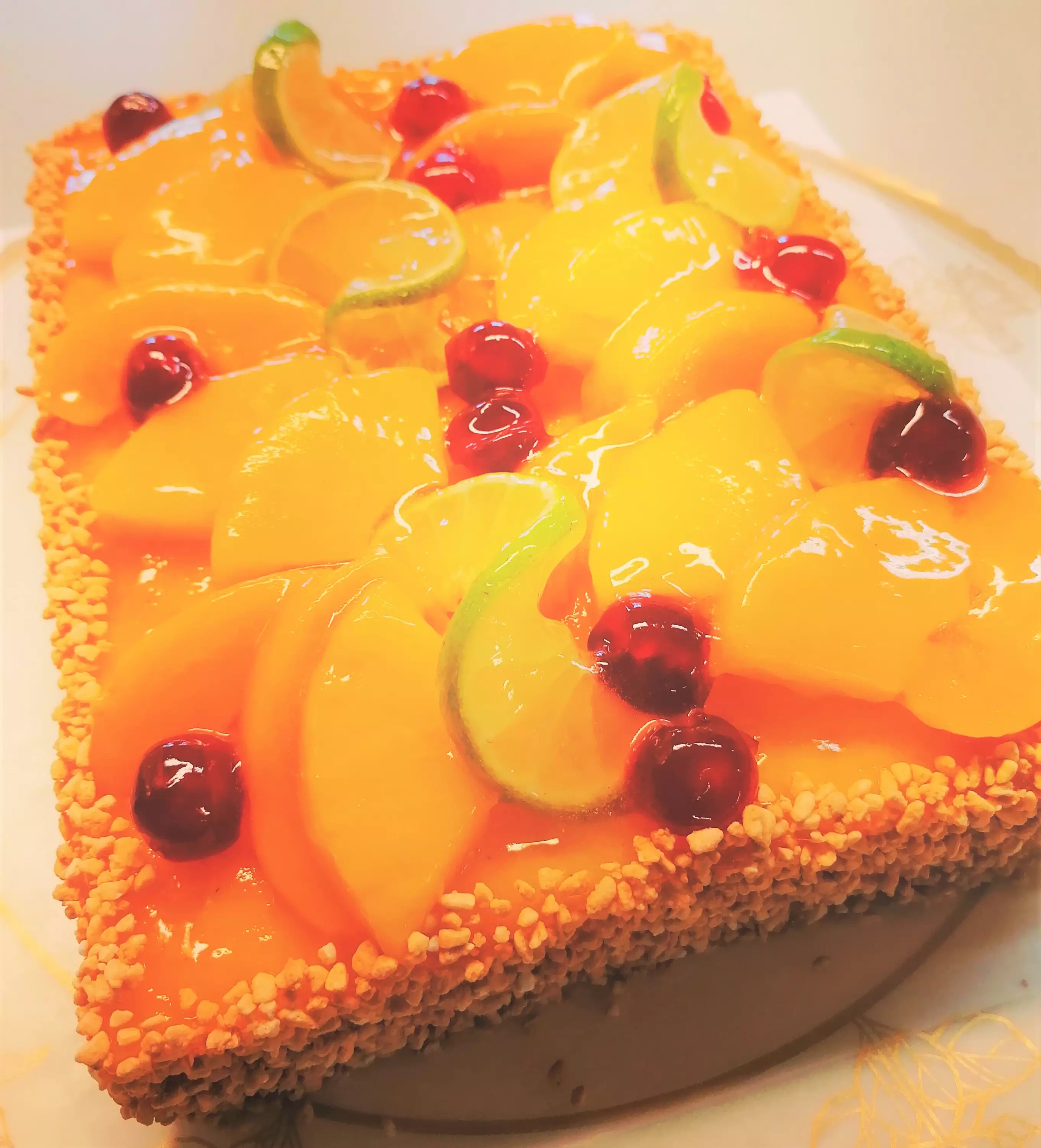 HEDELMÄKILOKAKKU (M) - 15 Hengen -herkullinen maidoton täytekakku, jossa runsas tropicaltäyte, päällä persikoita, ananasta ja kirsikkaa.