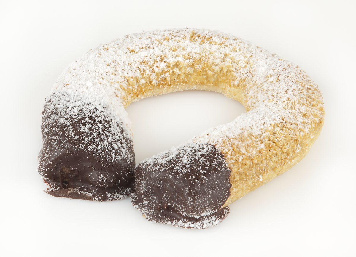 Voitaikinakuorinen omenatäytteinen herkku joka on vielä kastettu suklaassa.