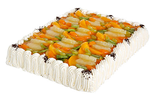 KERMAHEDELMÄKILOKAKKU (L) - 15 hengen herkullinen täytekakku, jossa kermaa, tropicaltäytettä, persikoita, ananasta ja kirsikkaa