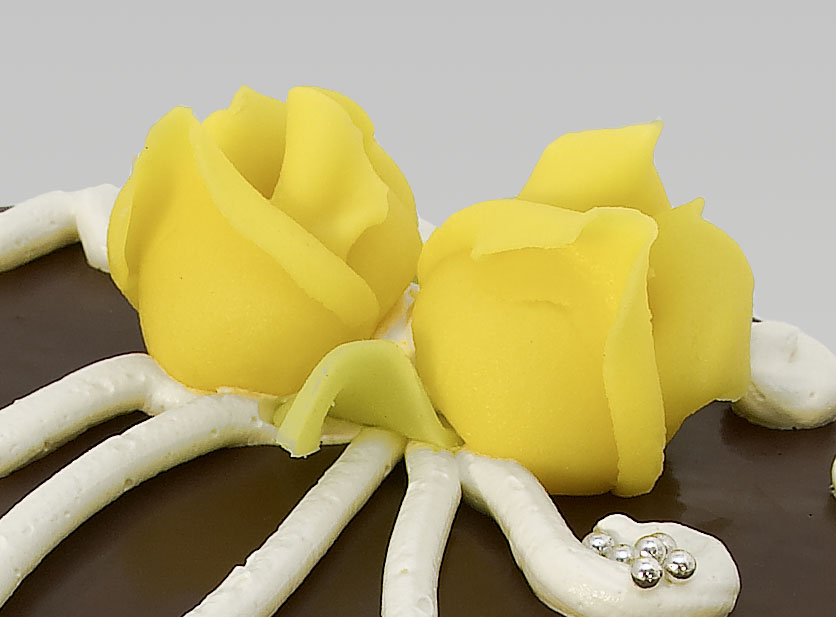 Marsipaaniruusu 2 kpl + lehdet voidaan laittaa valmiiksi kakun päälle.