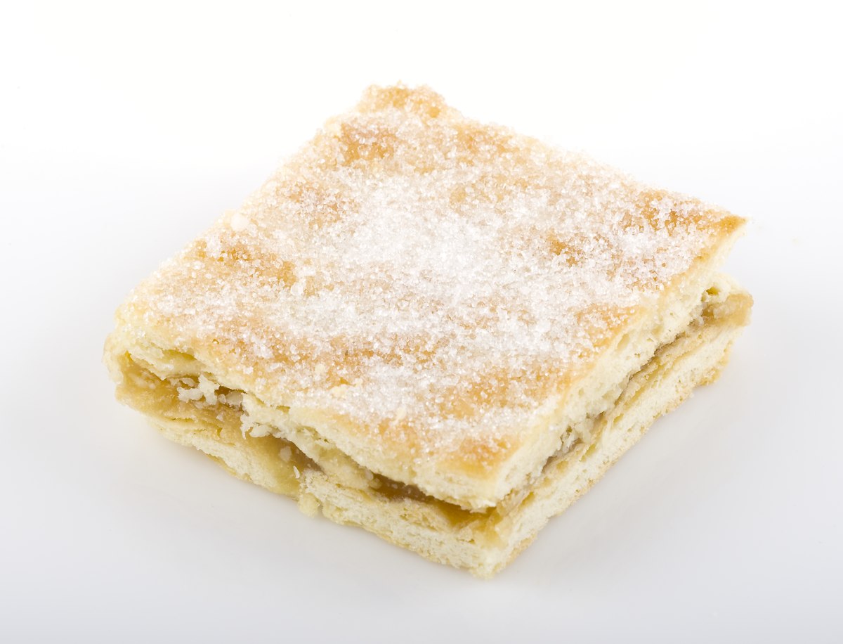 On perinteinen lehtevä leivos. Voitaikinakuorien välissä omenamarmeladia.