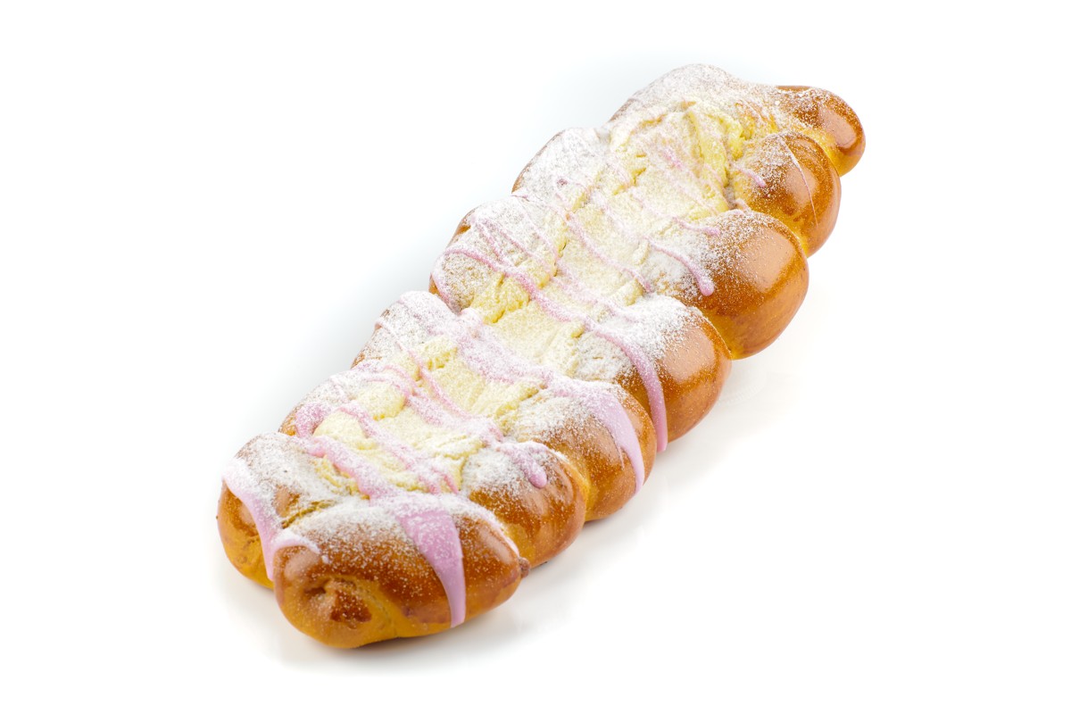 RAHKAPITKO (VL), reilusti rahkatäytettä, koristeena mansikanmakuista kuorrutetta.